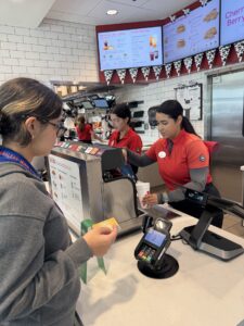 After shopping, students enjoyed lunch at Chick-fil-A. They took time to look over the menu and decide what meal best met their needs and budget. Students placed their own orders, handled their payments independently, and checked that they received the correct items, all while interacting respectfully and confidently with employees.